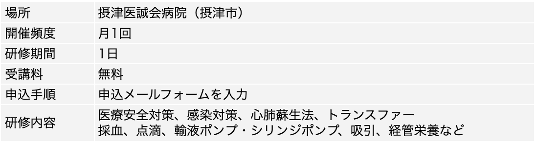 現場の生の声を聞いたり雰囲気を味わいたいという方には、医誠会系列病院の摂津医誠会病院のセミナーがおすすめです。1日の研修で最新の医療動向を聞けたり、医療機器を用いた演習が行えたりするので、忙しくて時間のない人でも参加できます。また、開催頻度も高く利用しやすいでしょう。