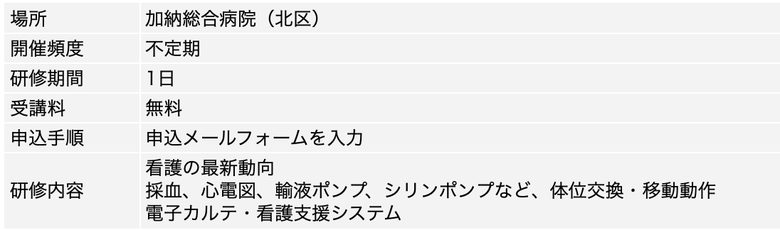 医療機関の生の声や実践を学びたいという方は、協和会 加納総合病院のセミナーもおすすめです。1日の研修で最新の医療動向を聞けたり、医療機器を用いた演習が行えたりします。ブランクの長い方にとっては電子カルテの取扱いもハードルが高く感じてしまいますが、研修内では電子カルテの操作方法を学び実際に体験することもできます。