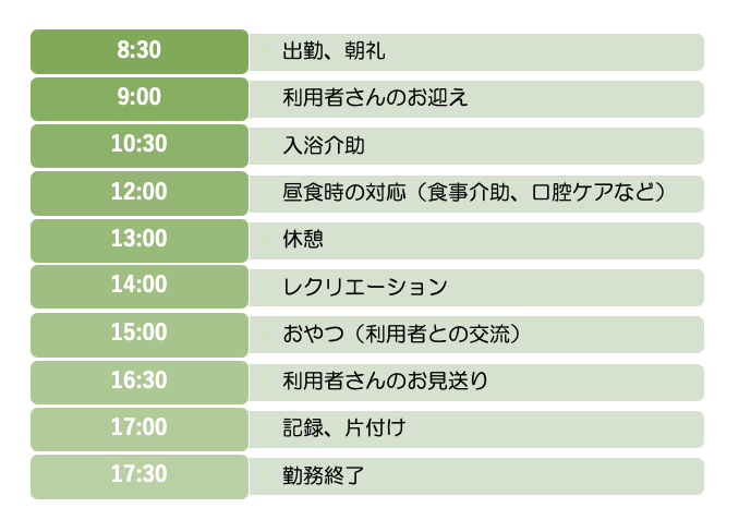 デイサービスで働く介護士は、次のようなスケジュールですごします。