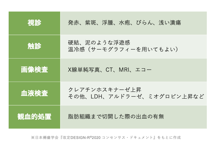 DTI疑いでも、他の急性期褥瘡と同じように発赤、紫斑、浮腫などの所見がみられることがあります。しかし、深部組織の状態は視診では把握しにくいため、「エコーなどの画像検査を行ってもよい」*2 とされています。