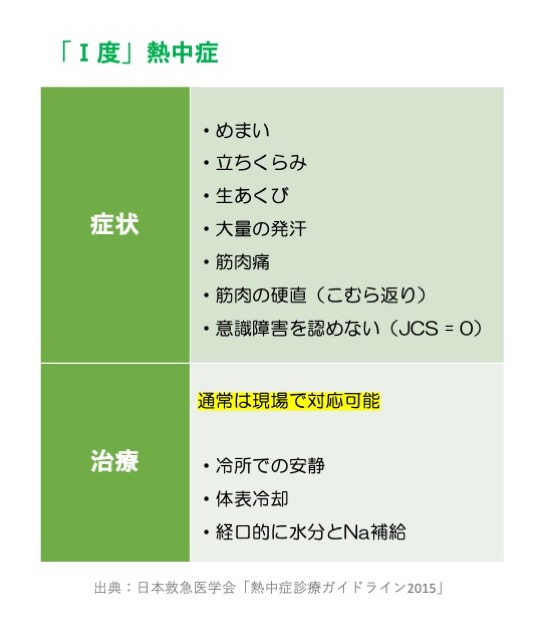 Ⅰ度の熱中症は、症状が徐々に改善している場合は現場での応急処置と見守りが可能な状態です。
