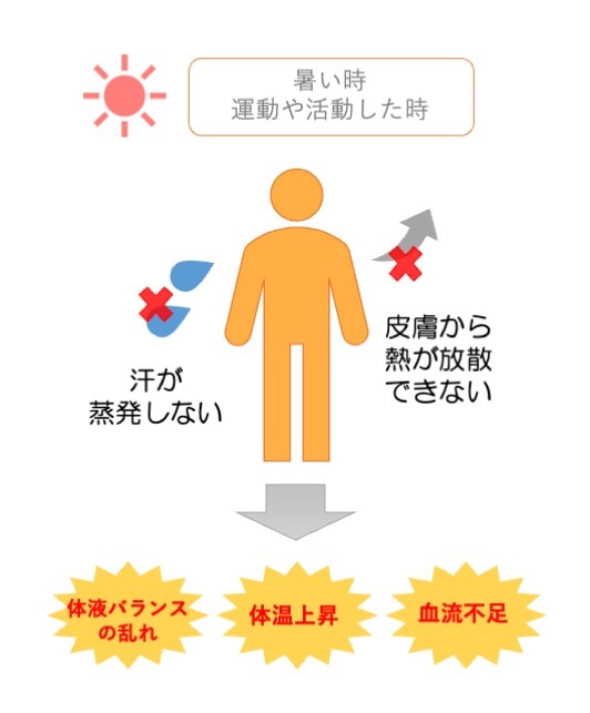 また、急激に汗をかくと、体内の水分と塩分が失われ、体液のバランスが崩れてしまいます。そして、血流が悪くなり、さまざまな症状や障害を引き起こします。