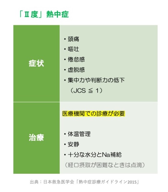 Ⅱ度の熱中症は、医療機関での診察が必要な中等症の状態です。