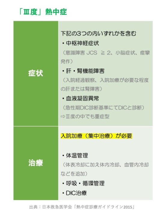 Ⅱ度の熱中症では、高度の脱水と重要臓器への循環血液量がさらに減少し、脳や他臓器にダメージが生じます。そして「中枢神経障害」「肝・腎機能障害」「血液凝固異常(DIC)」のいずれかを含む病態を引き起こします。