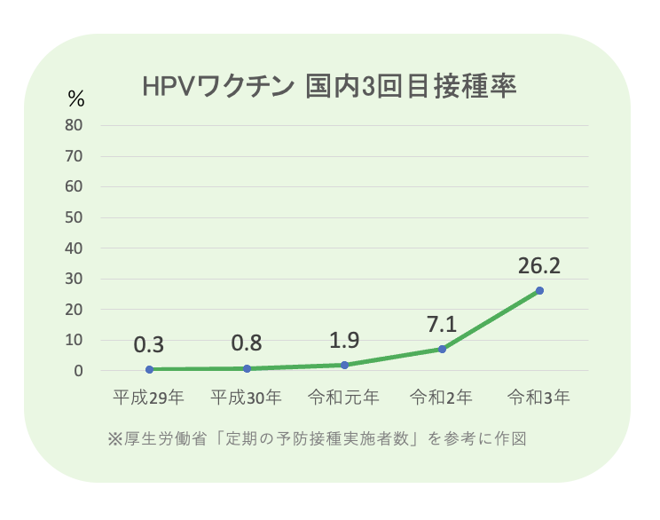 HPV接種率は日本では令和元年に1.9%であり、カナダやイギリス、オーストラリアなどの約80%に比べるとかなり低くなっていました*4 。しかし、キャッチアップ接種などの対応によって国内の接種率は徐々に上がってきています。