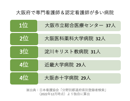日本看護協会の登録者をもとに、大阪府で専門看護師・認定看護師が多い病院をまとめました。