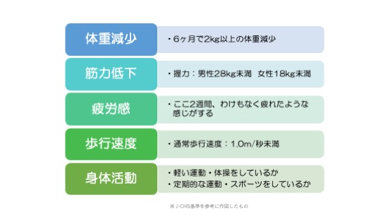 フレイルの評価方法としては、J-CHS基準(Cardiovascular Health Studyの日本語版)が用いられています。