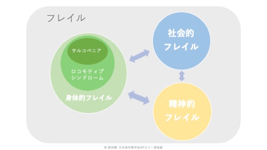 フレイルの概念はサルコペニアよりも広く、身体的なフレイルだけではなく、認知機能の低下といった精神・心理的フレイル、独居や経済的困窮などの社会的フレイルも含んでいます。