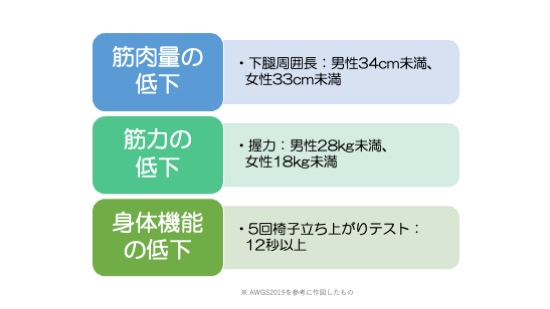 日本ではサルコペニアの診断基準として、AWGS2019(Asian Working Group for Sarcopenia 2019)が用いられています。