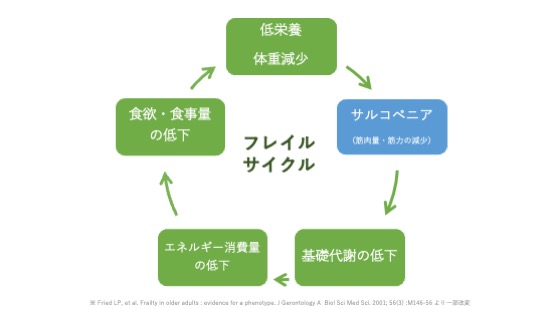 サルコペニアは筋肉量と筋力に限った問題ですが、それがきっかけとなり身体機能が低下し、活動量や基礎代謝の低下につながります。そして、エネルギー消費量が減り、食欲や食事量も下がってしまうと、結果的に栄養不足となりサルコペニアがさらに悪化するという悪循環に陥ってしまうのです。