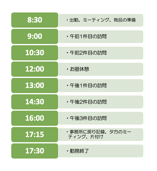 事業所や利用者数によって異なりますが、1日に5〜6件程訪問します。決まったスケジュールで動くため、基本的には時間通りに終業できます。