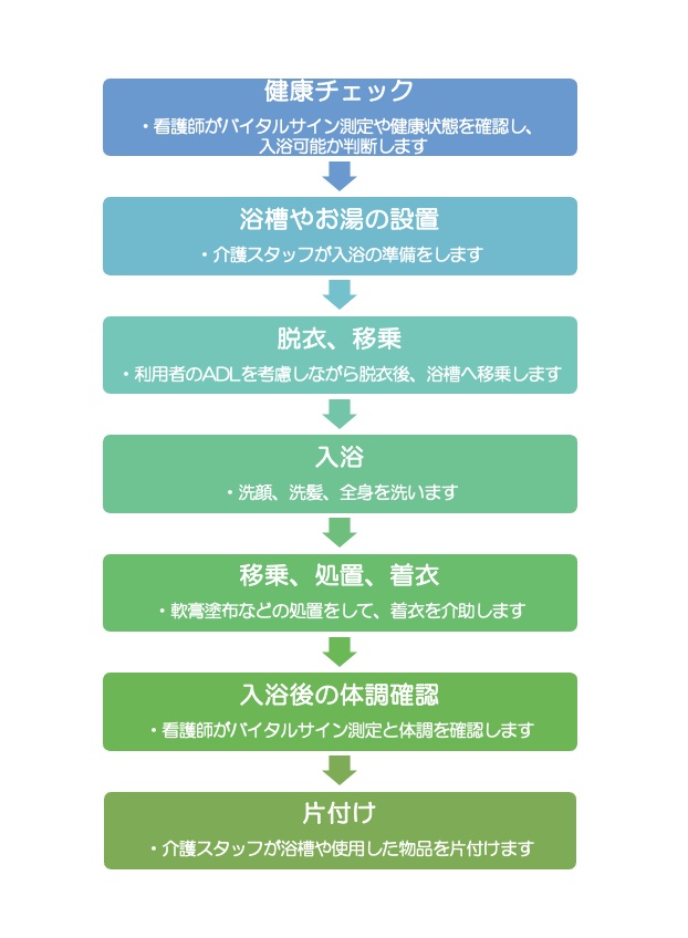 訪問入浴は以下のような流れで行います。